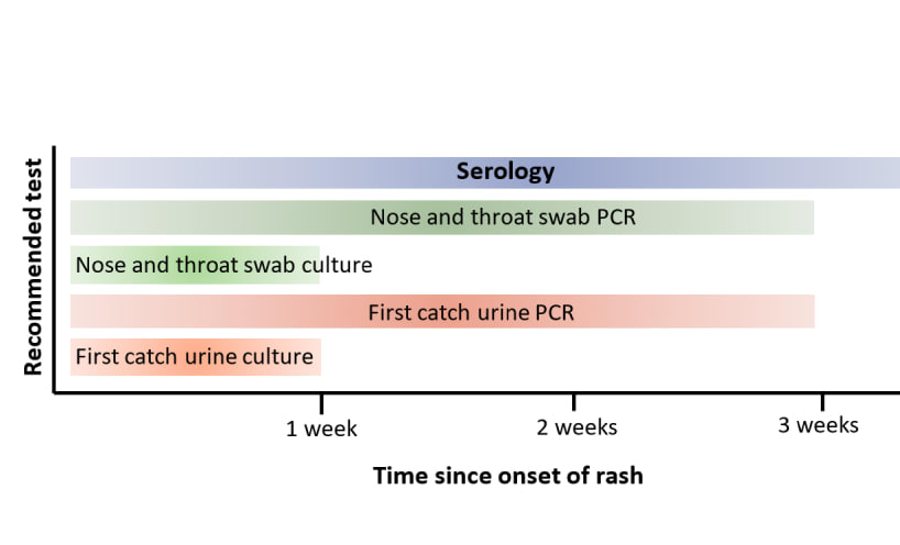 Clinicians should test for measles via polymerase chain reaction (PCR) and serology in any patients with compatible symptoms. Label PCR samples as ‘urgent’ and send to VIDRL via your primary pathology provider.
